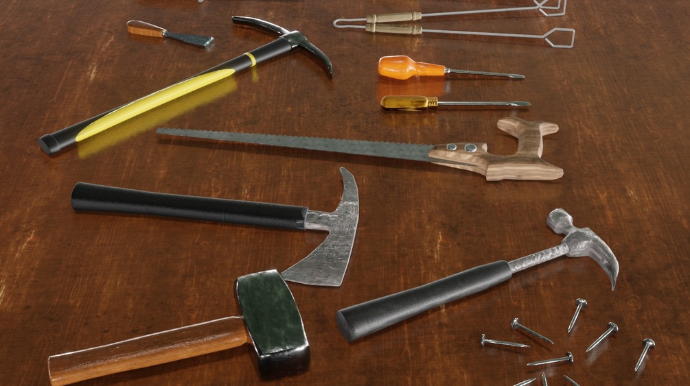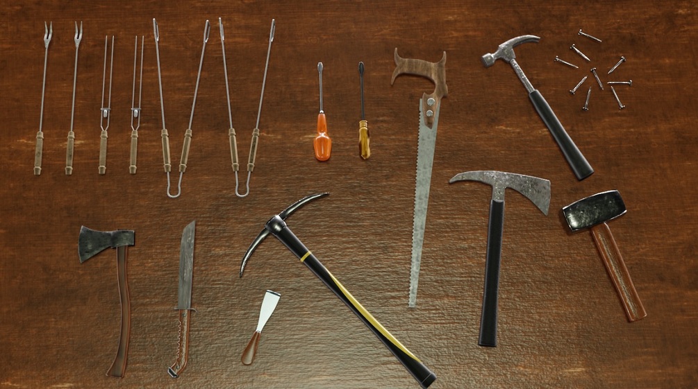 This collection features a wide range of popular tools, including axes, saws, hammers, barbecue tools, and much more, each with their unique textures and materials. The package includes individual models in addition to the Blender file with textures in various formats.